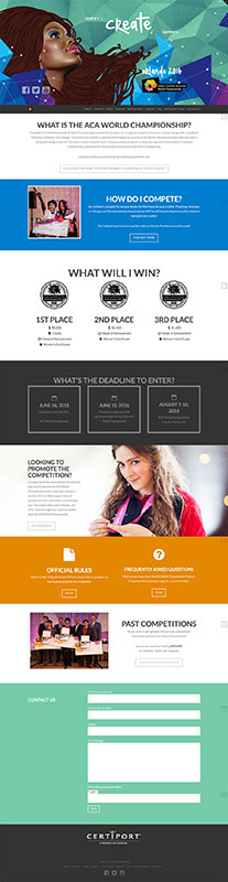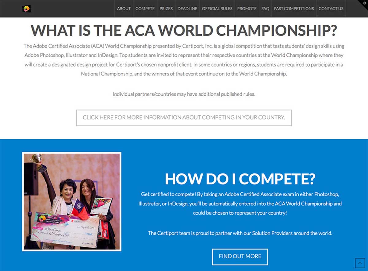 The Adobe Certified Associate (ACA) Competition section of the one-page site provides a clear, concise overview of the competition and how students can participate. With brief yet informative descriptions, visitors quickly understand the competition format, eligibility, and steps to compete.